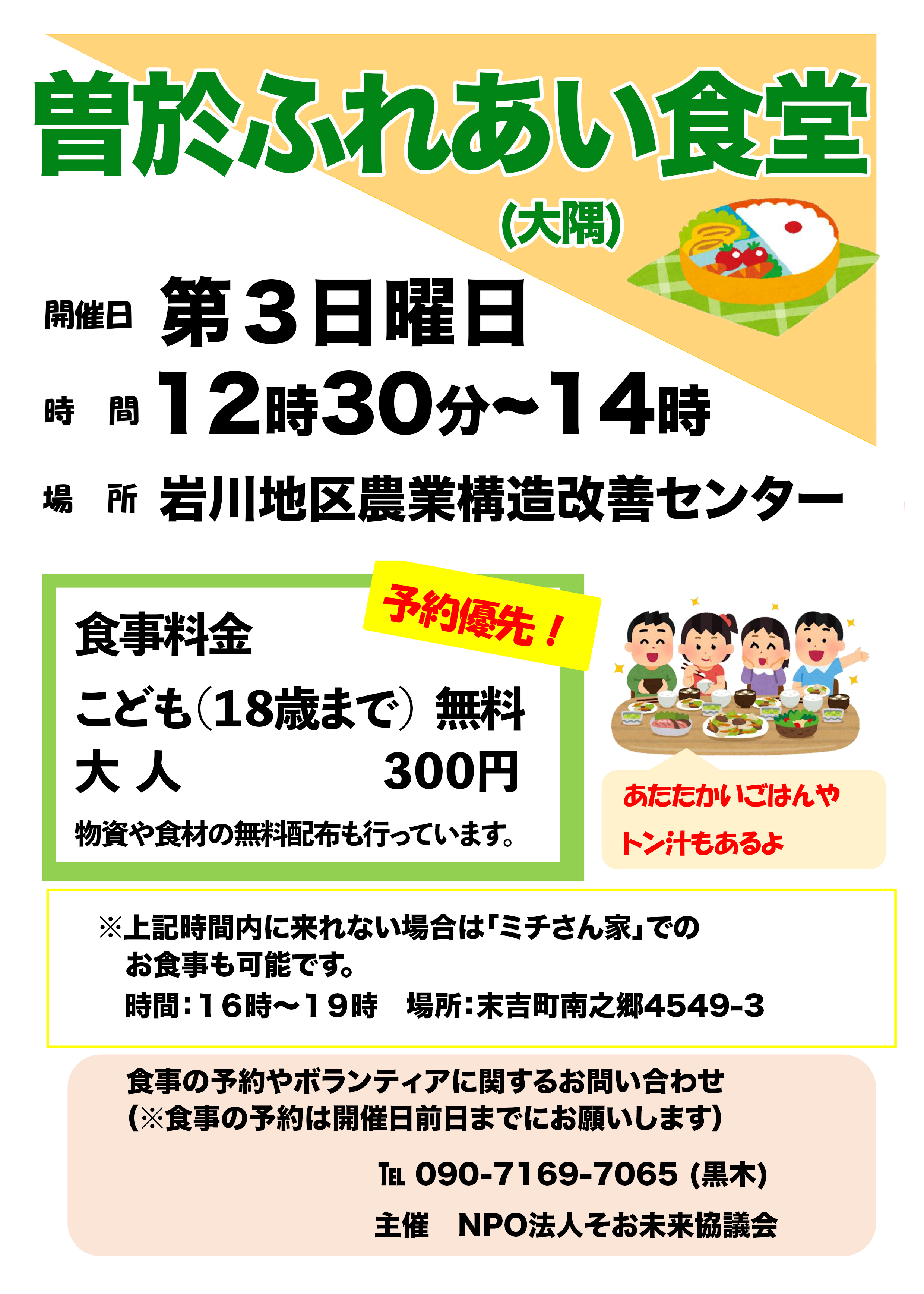 | 岩川地区農業構造改善センター(大隅文化会館裏)12時半〜14時 |