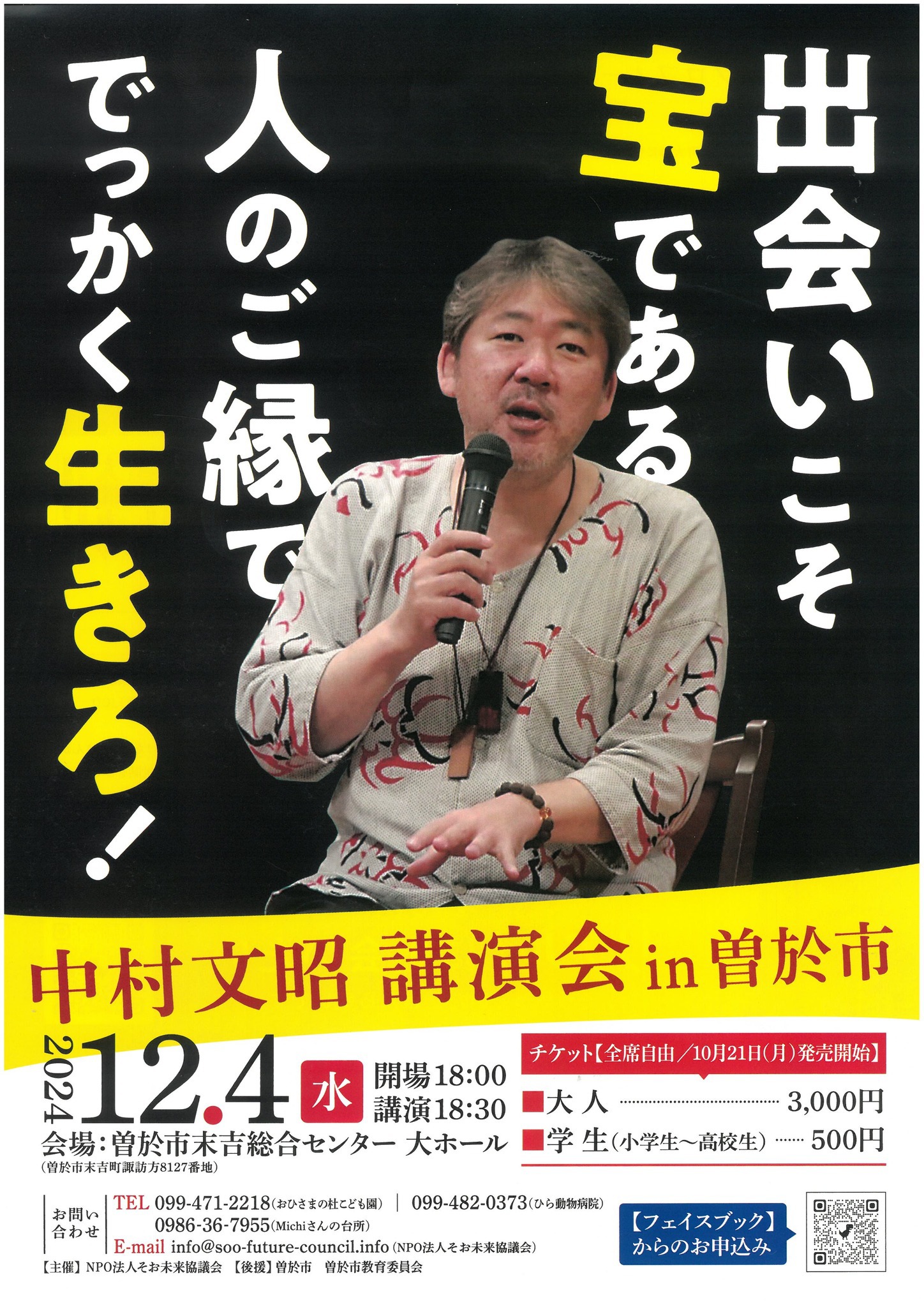 | 2024.1.23 | 李久惟氏講演会「台湾に伝わる日本の先人たちの生き様と功績」 18時開場 18時半~20時半 曽於市役所本庁舎南棟2階多目的室 参加費3,000円 定員50名 |